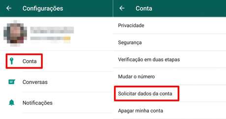 Na sequência, escolha a opção "Conta" e, depois, "Solicitar dados da conta".