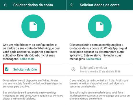 Sendo assim, algumas ações relacionadas a tais aspectos podem cancelar, sem aviso prévio, a confecção do relatório. Alterar o número de telefone do WhatsApp, registrar um novo aparelho ou excluir a conta no mensageiro também interromperão o processo, obrigando o utilizador a realizar a requisição novamente, aguardando o prazo. Uma vez pronto, o arquivo fica disponÃvel por "algumas semanas", de acordo com a empresa, mas só reflete as informações disponÃveis até o momento da solicitação.